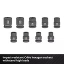 12 slagdoppen van 40 mm lengte, vervaardigd uit chroom-molybdeenstaal (CrMo) met mangaanfosfaatcoating, sterker dan conventioneel chroom-vanadiumstaal (CrV).