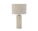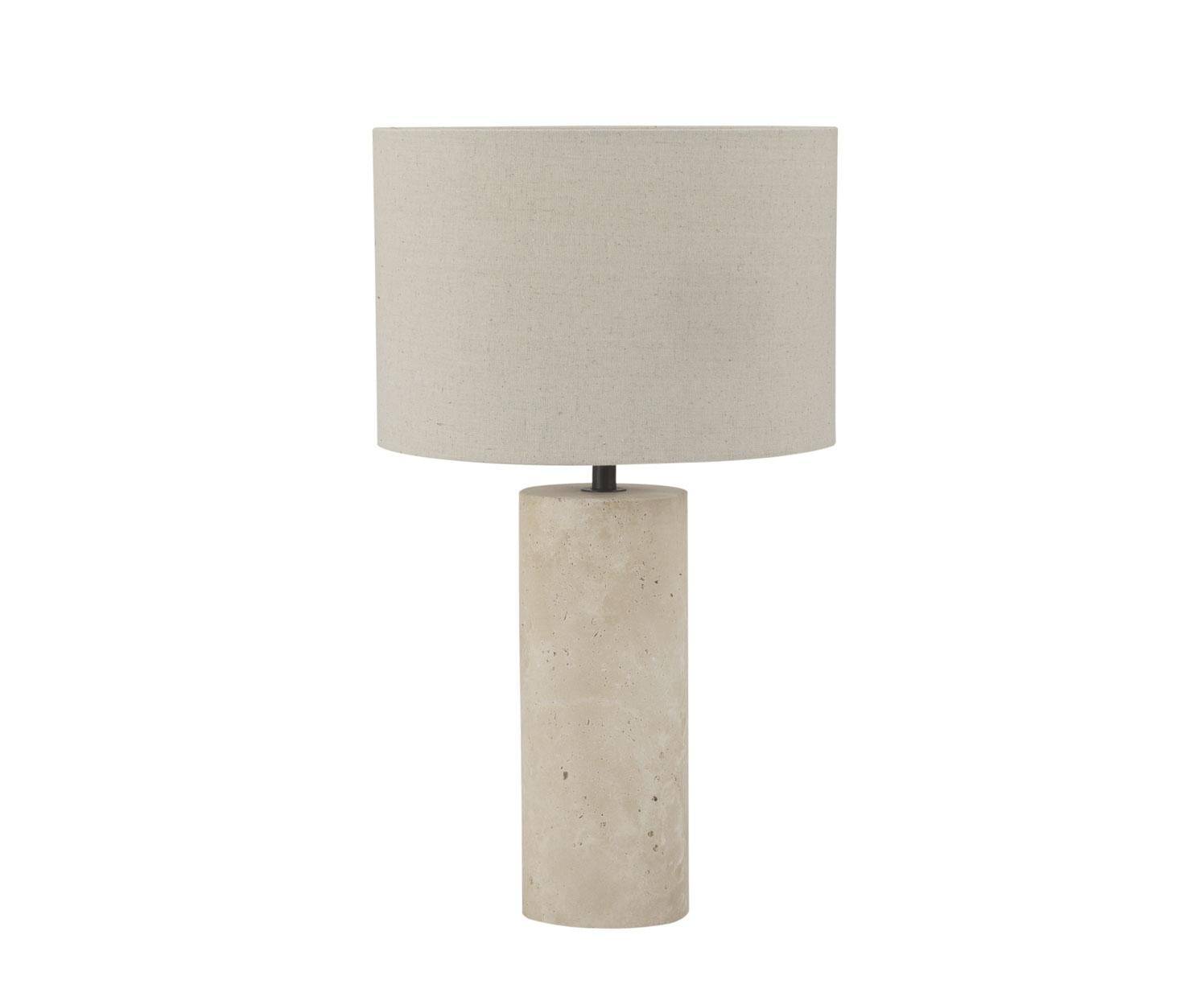 Decoratieve lamp Glow van Andrea House met voet van natuurlijk travertijn en beige linnen kap, ontworpen om zacht, sfeervol licht te creëren in woonkamers, slaapkamers of leeshoeken. De organische esthetiek zorgt voor visuele en textuurlijke warmte in elke hoek van het huis.